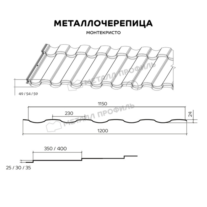 МОНТЕКРИСТО подходит для эксплуатации независимо от вида строительства и климатических условий. Указанный профиль эстетично выглядит на скатах малой и большой площади, подчеркивая красоту всех видов кровли. Полная глубина стальной черепицы ― 49, 54 или 59 мм, высота ступеней ― 25, 30 и 35 мм, их длина ― 350 и 400 мм. С рассматриваемым профилем крыша будет выглядеть так, будто покрыта глиняной черепицей. Приобретайте изысканную стальную черепицу МОНТЕКРИСТО в Компании Металл Профиль (КМП)!