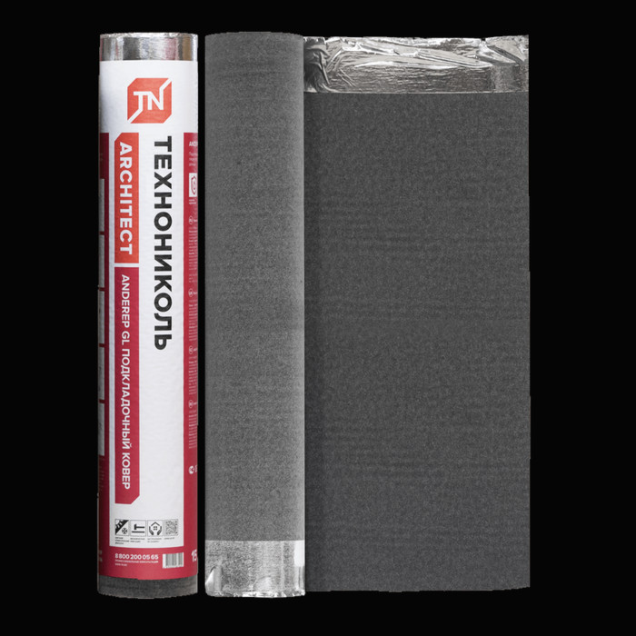 Битумно-полимерный подкладочный ковер механической фиксации с клеевыми монтажными полосами с основой из стеклохолста для скатных кровель с финишным покрытием из гибкой битумной черепицы.